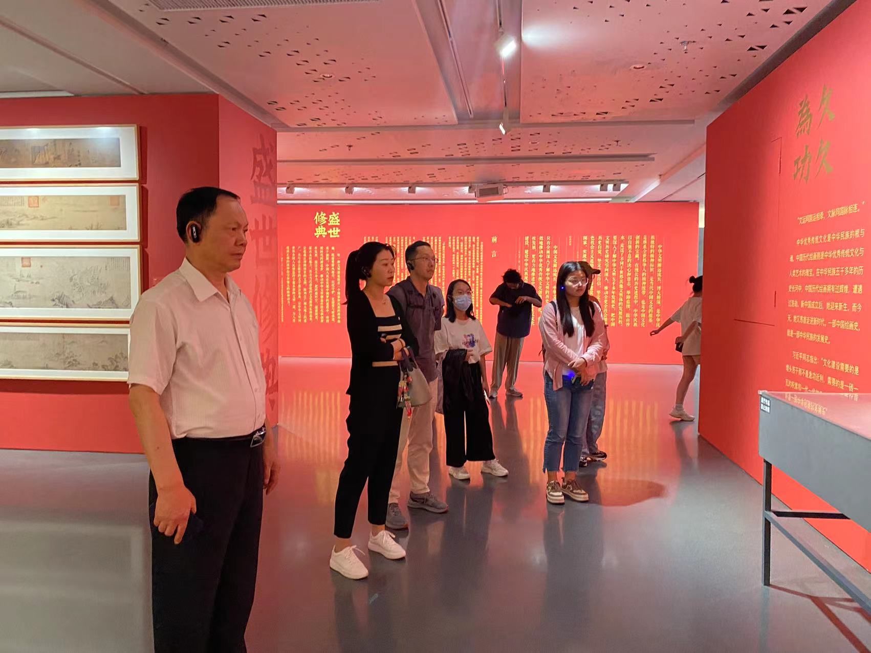 走进文化艺术中心,由12479道彩色丝线构成的壮美景象映入眼帘,象征着12479幅中国历代名画贯穿历史长河,打开了一条联结千古文明的艺术通道,为我们展现了一部熠熠生辉的中国绘画史。进入展厅,一幅幅传世名画让人应接不暇,《簪花仕女图》《步辇图》《韩熙载夜宴图》……在讲解员的引导下,师生们驻足欣赏、品味抒怀,聆听了一段段荡气回肠的传奇故事,以及“大系”与嘉兴的渊源往昔。“文运同国运相牵,文脉同国脉相连。”在中华民族五千多年的历史长河中,中国历代绘画历尽沧桑,拥有过辉煌,亦遭遇过浩劫。新中国成立后,她迎来新生。而今天,伴随着中国特色社会主义事业的发展,她又昂首挺进新时代。一部中国绘画史,就是一部中华民族的发展史,反映了中华民族留下的光辉灿烂的文化印记,生动地展现出可信、可爱、可敬的中国形象。