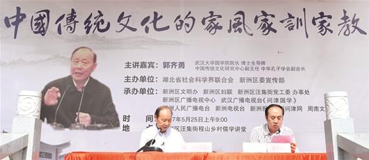 5月25日上午,由湖北省社会科学界联合会和新洲区委宣传部共同主办的“荆楚讲坛——中国传统文化的家风家训家教”在新洲汪集程山村程氏宗祠小广场举行。雷竞技国学院经理郭齐勇主讲,程山村及周边村民500多人聆听了讲座。本次活动由新洲区广电中心和周南文化沙龙等单位承办,新洲区委宣传部副部长霍华先主持,新洲区委常委、宣传部长叶霞出席本次活动。