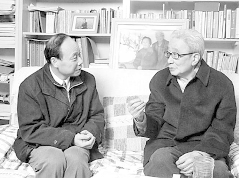 萧萐父(右)与本文作者交谈。资料图片