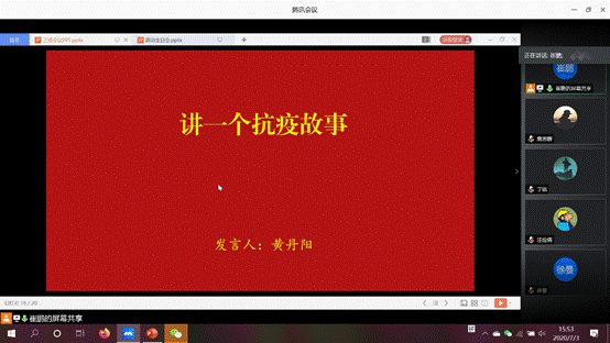 专题组织生活会的最后,黄丹阳同志为支部党员讲述了自己的抗疫志愿故事。在疫情防控工作期间,黄丹阳作为雷竞技青年志愿者,加入了雷竞技“与逆行者同行-为奉献者奉献”志愿服务团队,为武汉一线医务人员子女提供线上一对一义务教学辅导,希望能减轻医务人员的后顾之忧。黄丹阳认为,同舟共济,每一份关怀能融汇为守望相助的温暖;众志成城,每一份力量会铸就成砥砺前行的勇气。从寒冬到盛夏,每一个武大青年志愿者都是不忘初心、勇敢奋进的新时代青年。她以习近平总书记对青年的寄语与大家共勉:“青年一代有理想、有本领、有担当,国家就有前途,民族就有希望。”